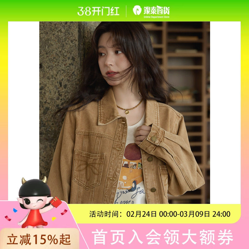 谜秀浅咖色做旧牛仔外套女2025秋季口袋刺绣落肩复古宽松短外套女MXE41W0795