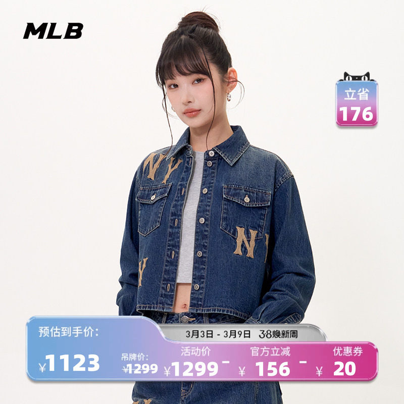 25新款MLB女款牛仔外套NY刺绣翻领短款衬衫休闲运动夹克3FDRG0254