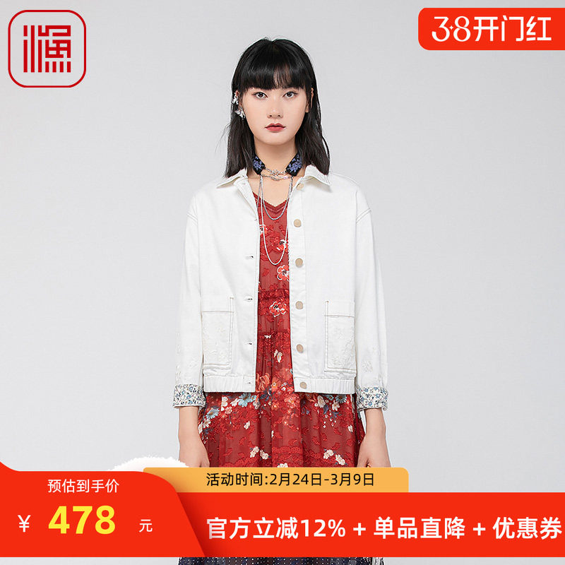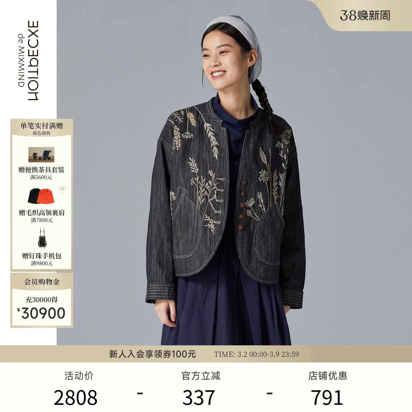 EXCEPTION例外女装春秋款纯棉绣花复古气质短款仿牛仔外套
