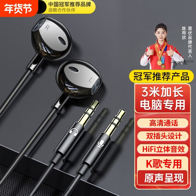 台式电脑耳机有线入耳3米延长耳麦双插头带麦克风直播K歌监听游戏