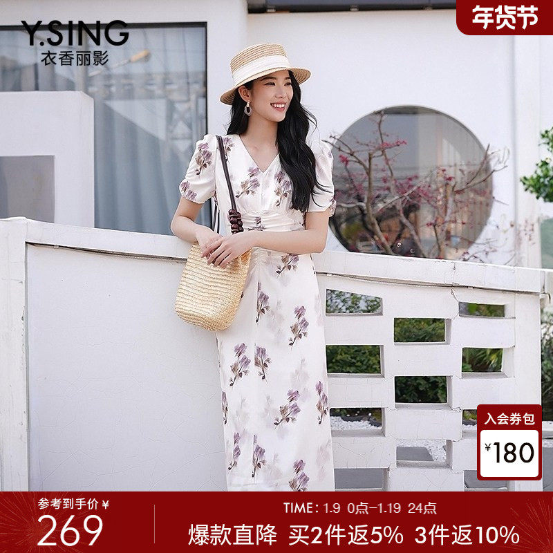 衣香丽影米色碎花雪纺印花连衣裙女2025年春装新款法式掐腰长裙子