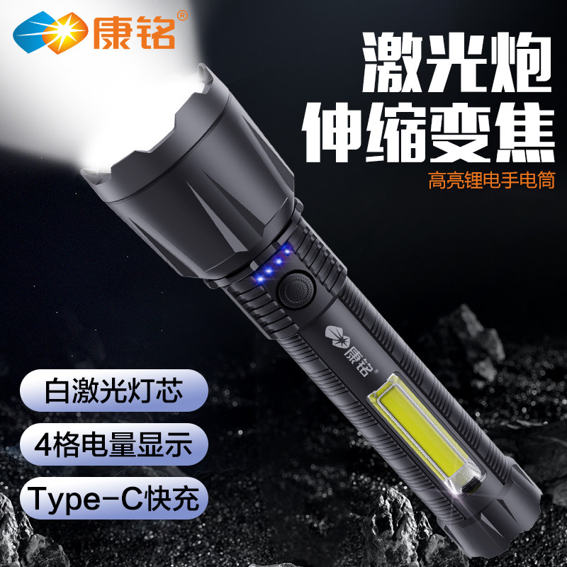 康铭户外强光手电筒变焦超亮远射家用白激光小照明灯迷你便携充电
