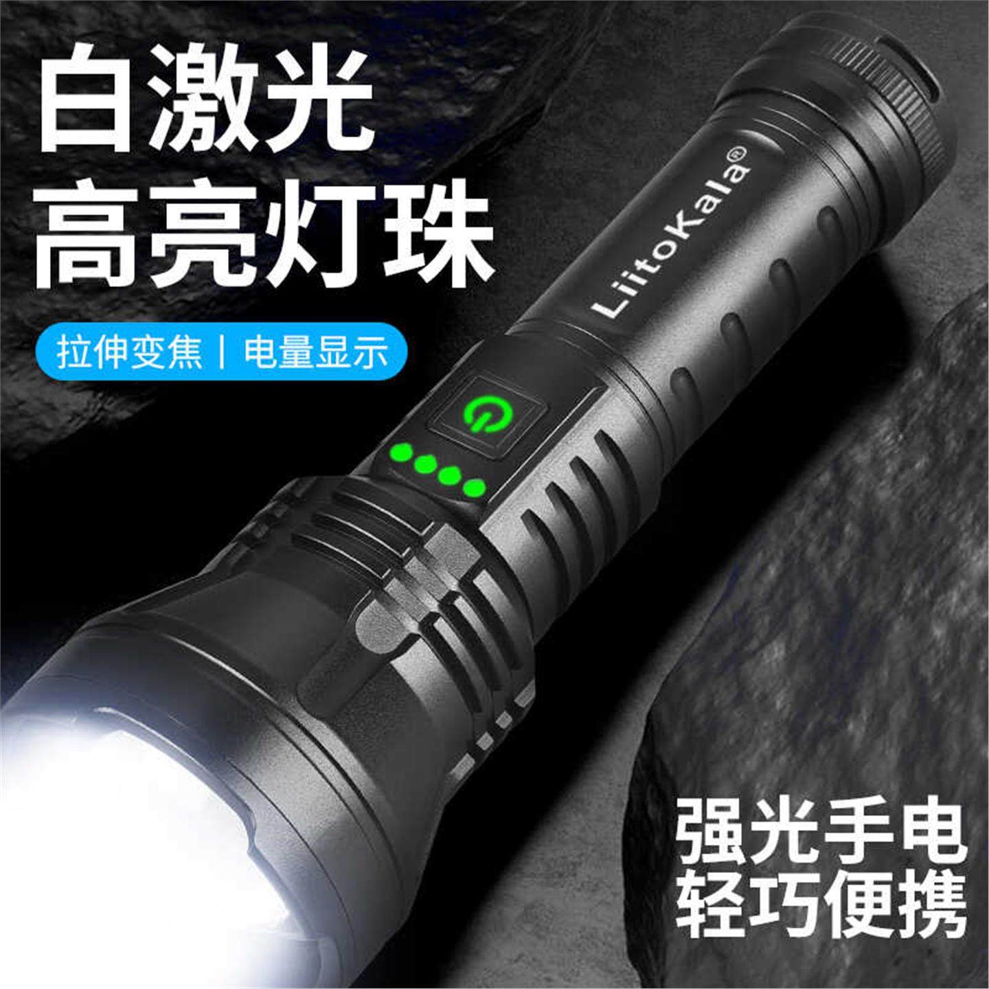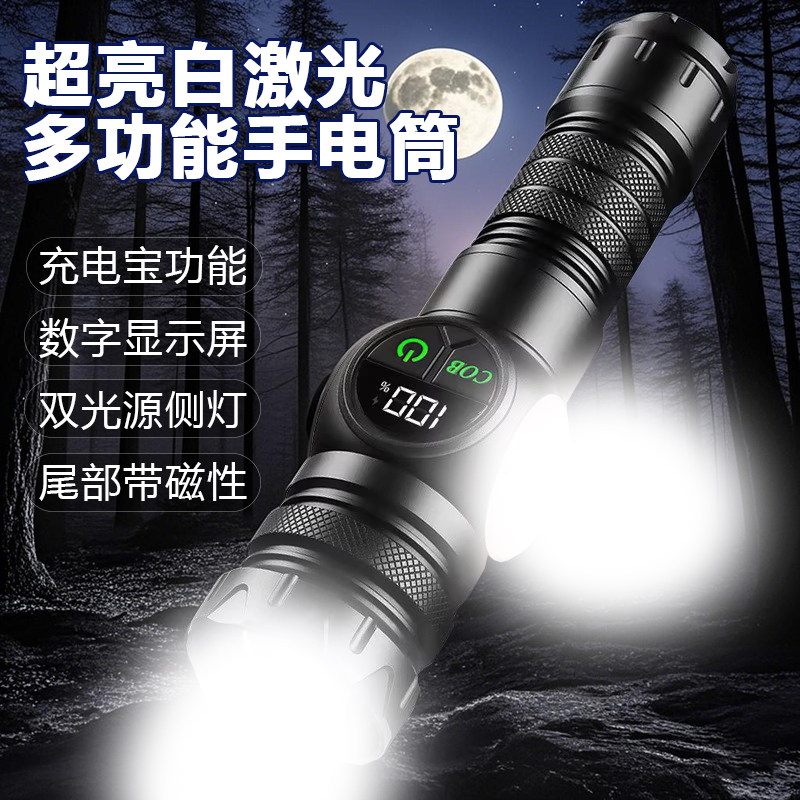 户外强光手电筒充电式远射变焦白激光LED户外照明双光源侧灯屏显