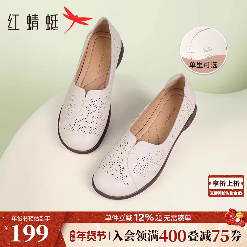 红蜻蜓妈妈鞋一脚蹬女鞋舒适软底鞋子中老年人皮鞋女真皮镂空单鞋