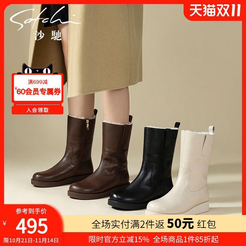 沙驰女鞋厚底加绒保暖雪地靴2025冬季新款时尚百搭中筒靴毛毛靴子