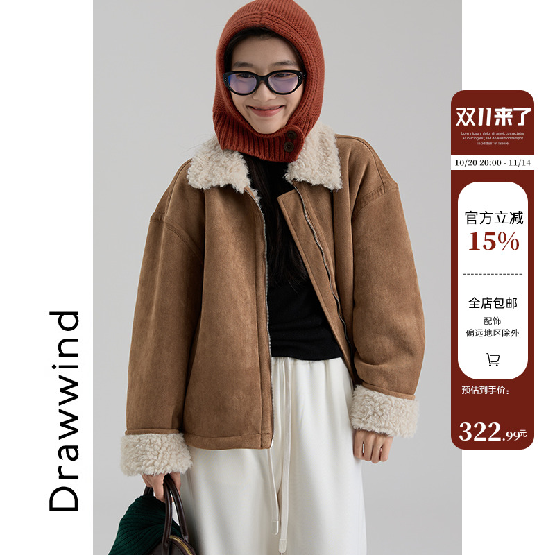 画风drawwind2025新款仿麂皮羊羔毛外套女冬皮毛一体短款翻领上衣