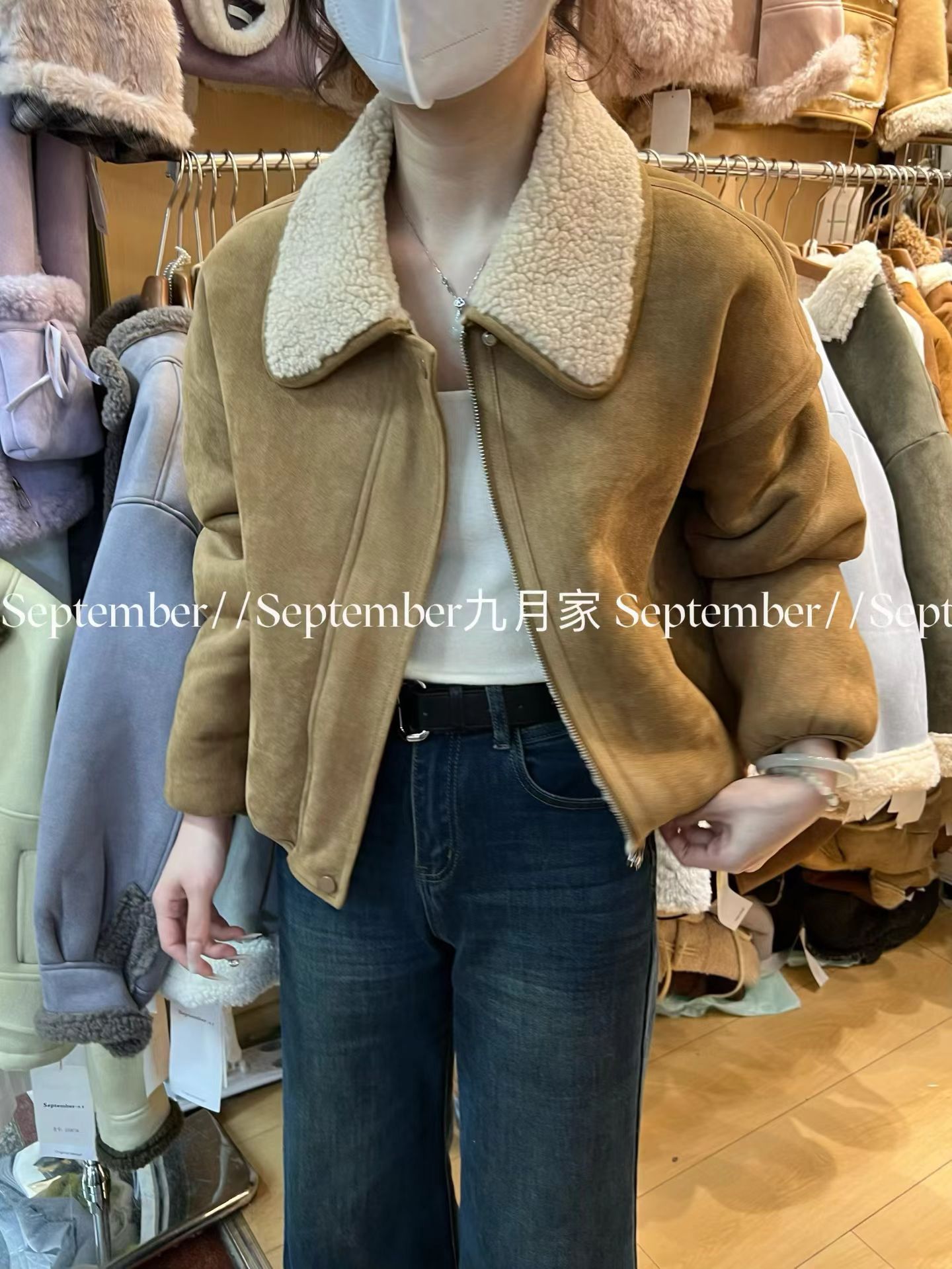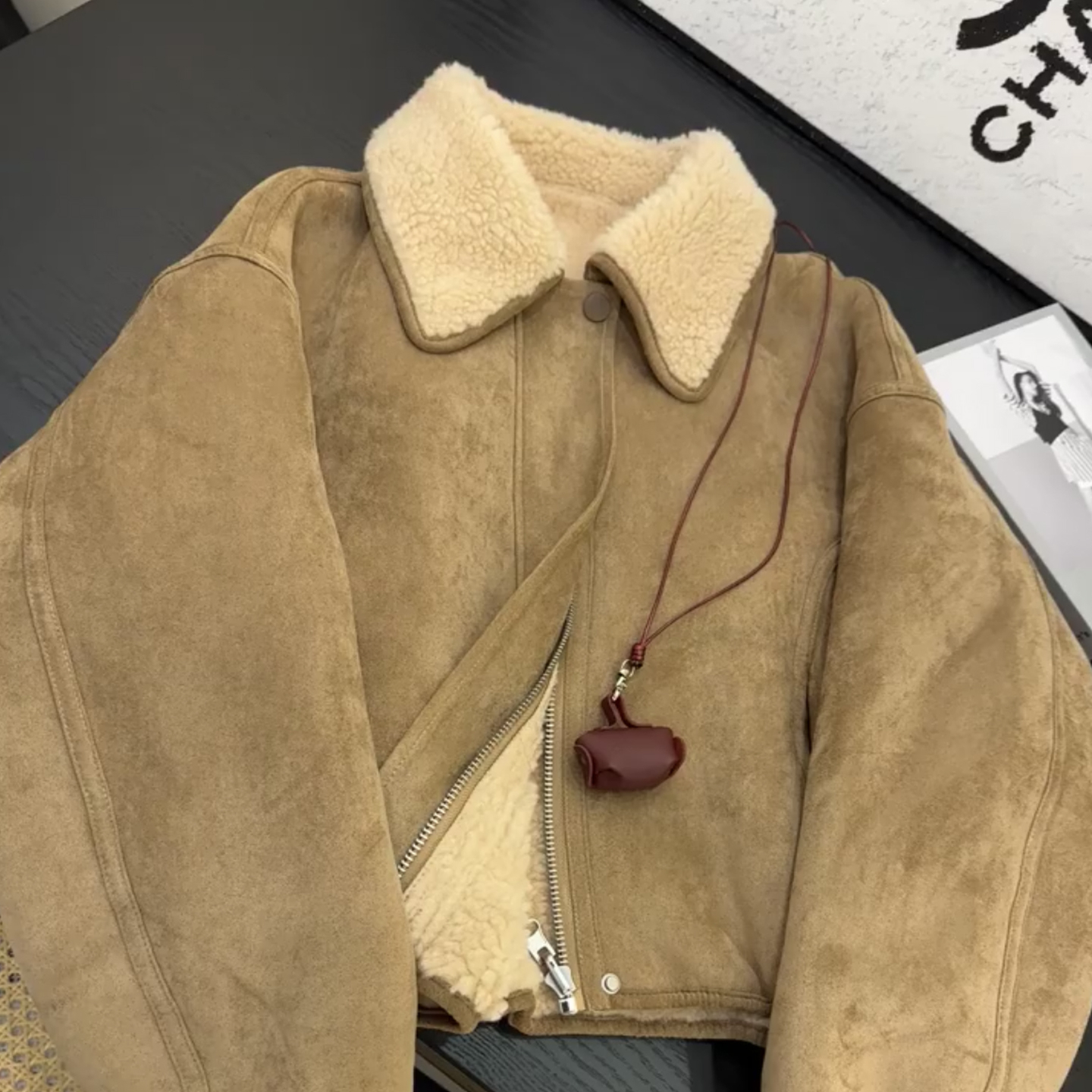 2025冬季短款翻领保暖麂皮羊羔毛外套女加绒加厚皮毛一体夹克上衣