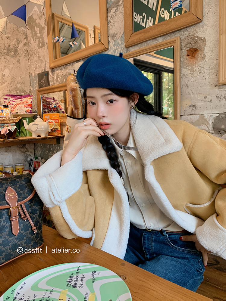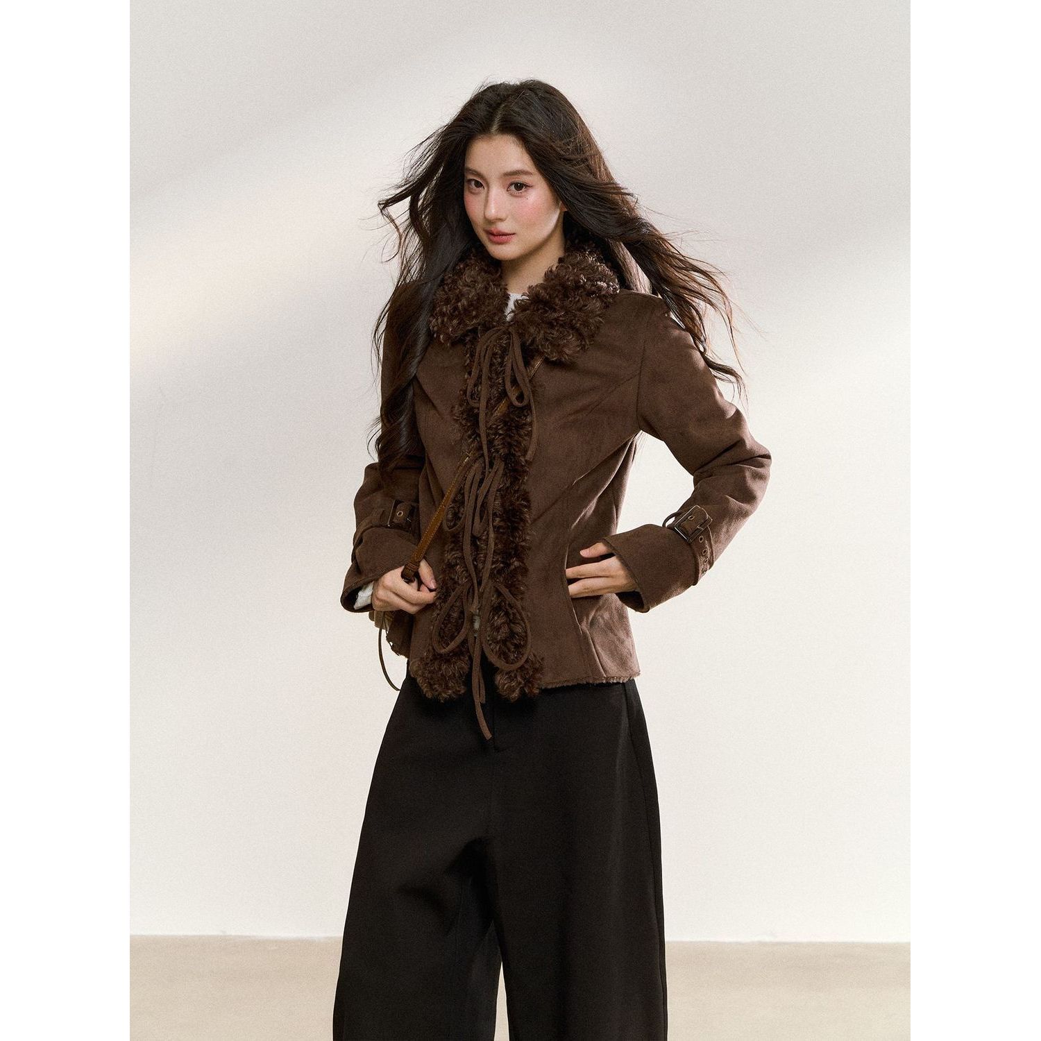 COCO ZONE 刘11 ”小火炉“100绵羊毛复古翻领麂皮羊羔毛外套女