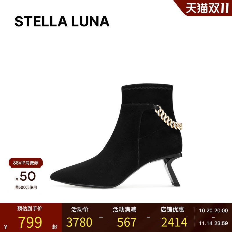 STELLA LUNA女鞋FW24新款黑色秋季高跟气质时尚金属串链法式短靴