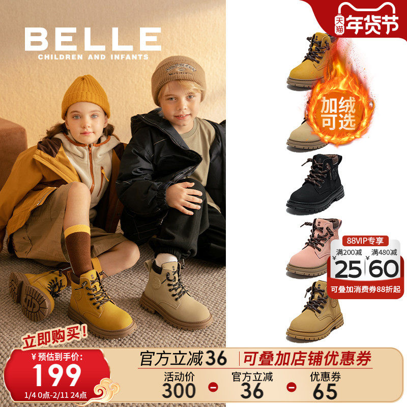 百丽童鞋儿童马丁靴2025秋冬新款女童工装靴宝宝加绒保暖大黄靴子