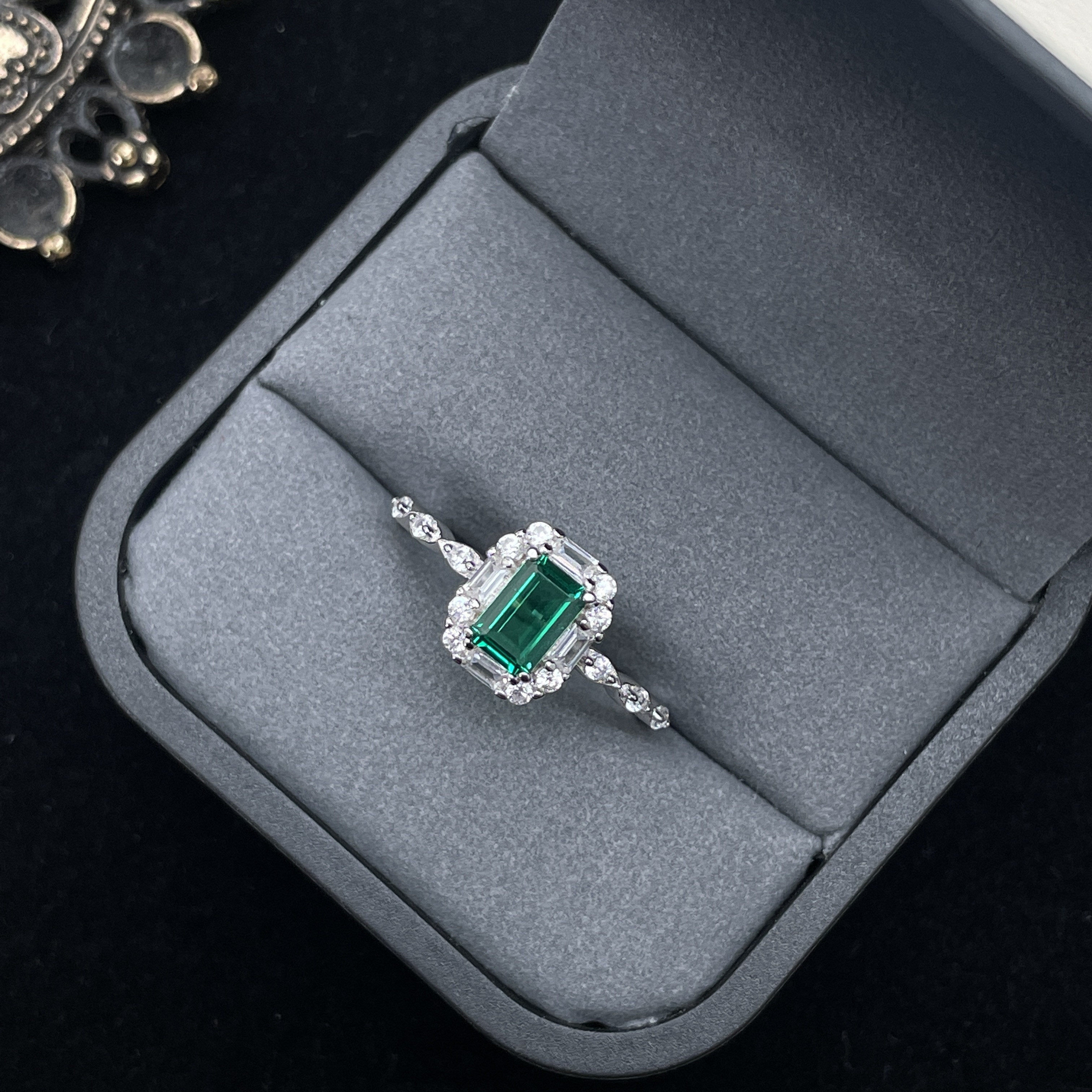S925纯银菱形细臂戒指镶嵌祖母绿方形培育高碳钻冰糖时尚简约钻戒