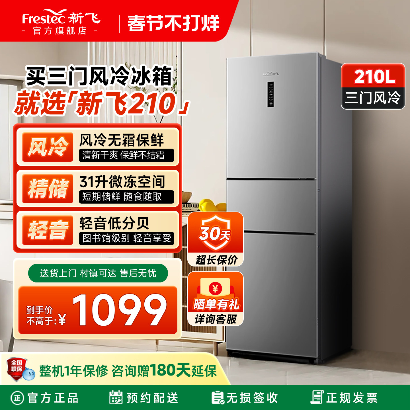 新飞210L三开门风冷无霜冰箱家用节能出租房宿舍小型三门式电冰箱