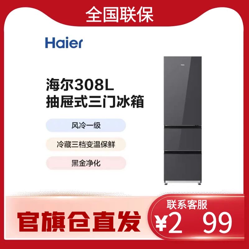 海尔BCD-308WGHD3E7YS全开抽屉式无霜全温区三门308升家用冰箱