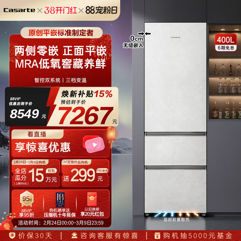 以旧换新补贴卡萨帝400L原创平嵌三门嵌入式一级效家用超薄电冰箱