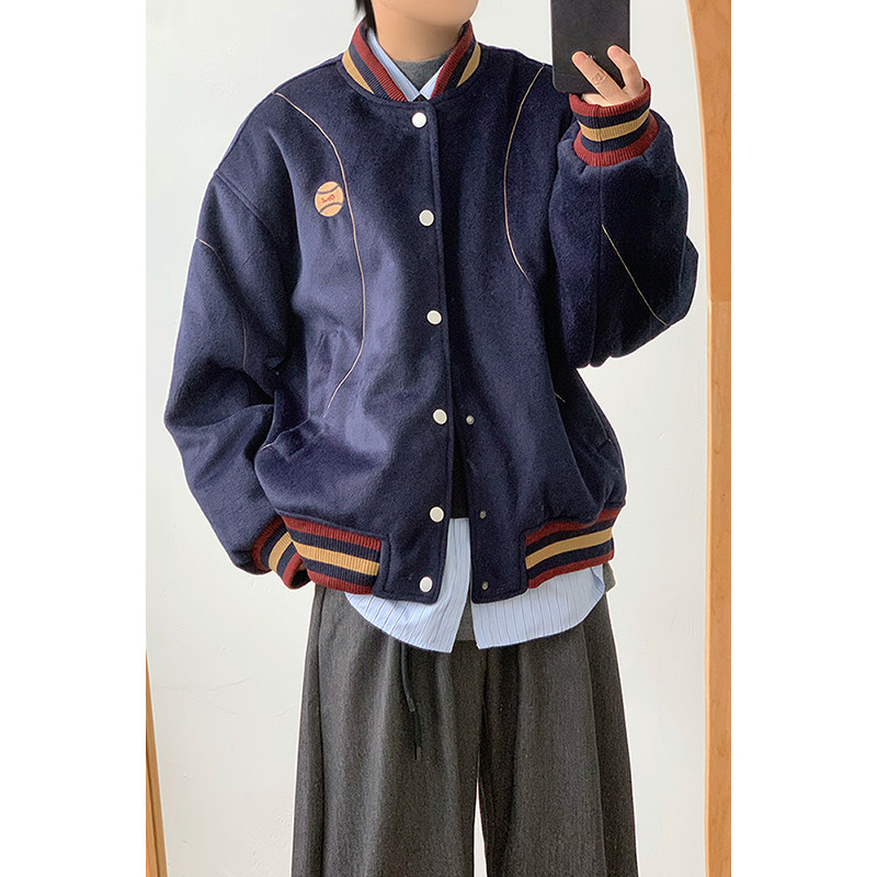 林弯弯美式加厚撞色刺绣复古棒球服棉衣保暖加棉宽松夹克棉服外套