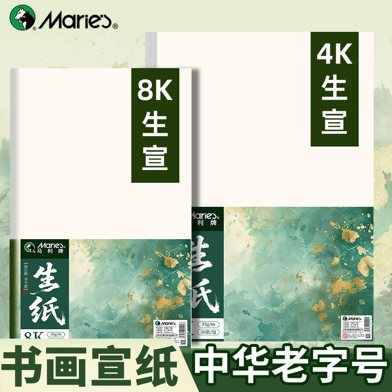 马利半生熟宣纸美术专用生宣纸4开8开入门半生半熟书画4K8K书法纸作品熟宣国画工笔画初学者专用四尺写毛笔字
