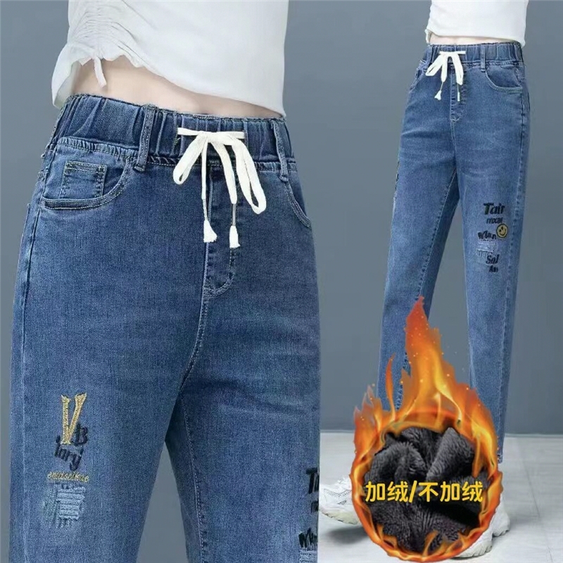 冬装加绒哈伦牛仔裤女2025春秋冬季新款大码宽松显瘦休闲萝卜裤子