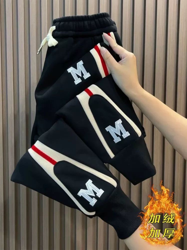 加绒加厚秋冬季卫裤男女时尚拼接高腰显瘦长裤百搭束脚哈伦运动裤