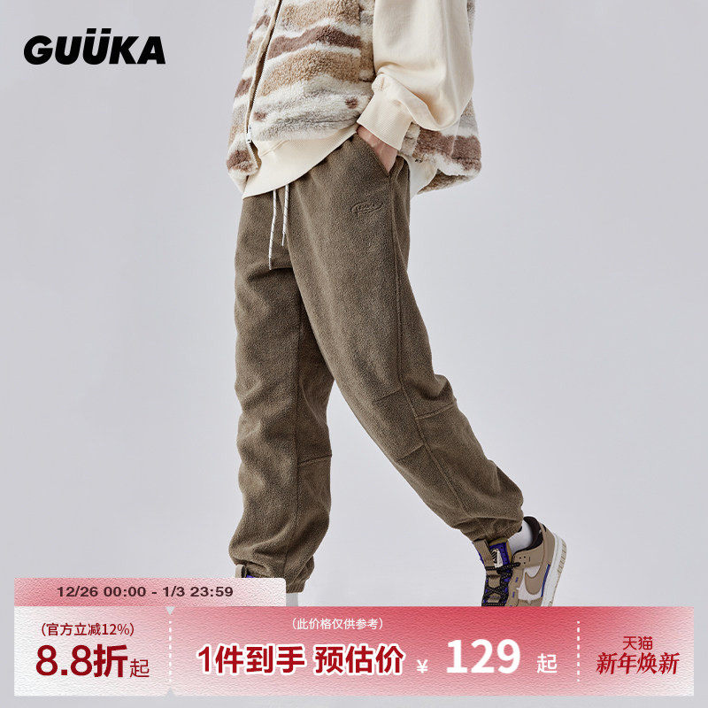 GUUKA咖啡色冬季卫裤男加绒加厚 户外山系美拉德穿搭束脚裤子宽松