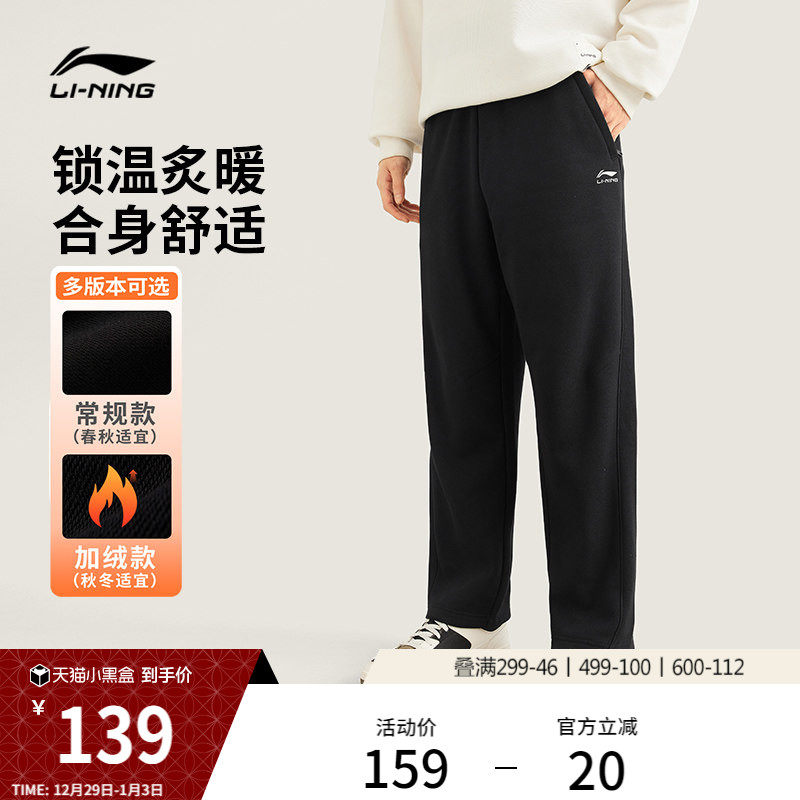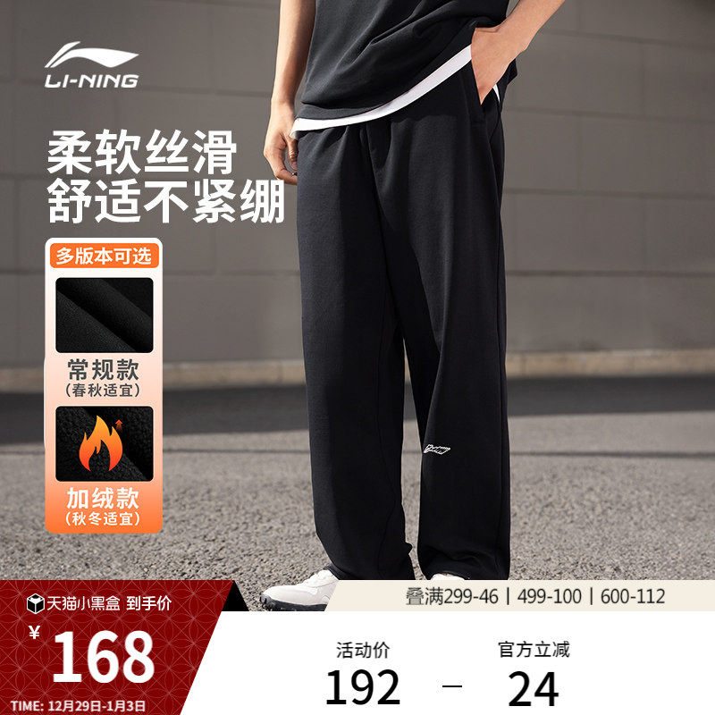 李宁卫裤男士冬季宽松黑色裤子直筒休闲裤加绒跑步裤针织运动裤男
