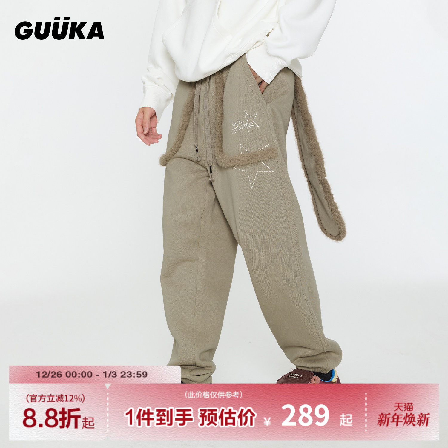 GUUKA毛绒兔耳朵冬季卫裤男束脚裤子女潮 加绒长裤宽松堆堆裤新款