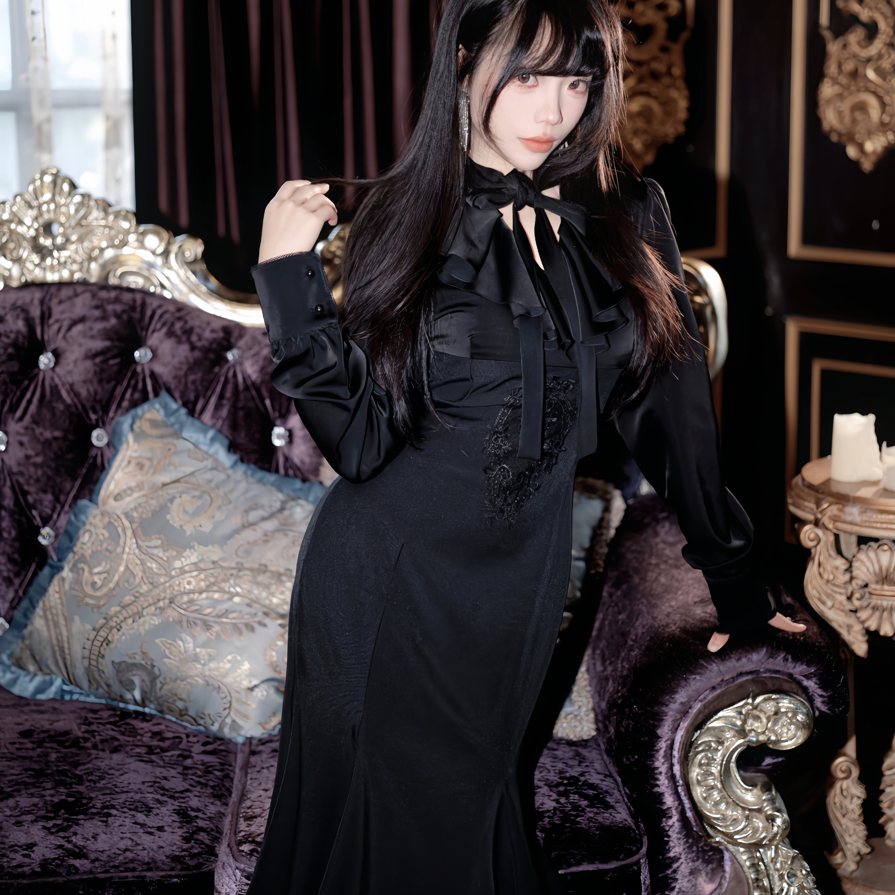 秋冬黑色灯笼袖丝绒长款连衣裙2025一字肩V领收腰遮肚包臀鱼尾裙