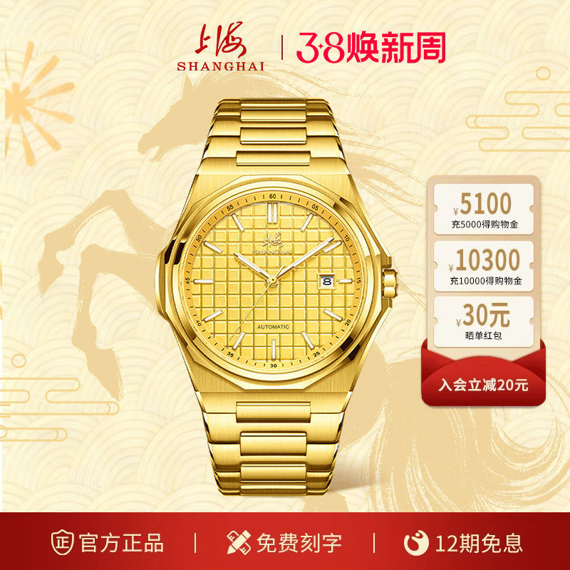 黄金时代上海表新款大金砖24K足金钻石表夜光全自动机械表男腕表