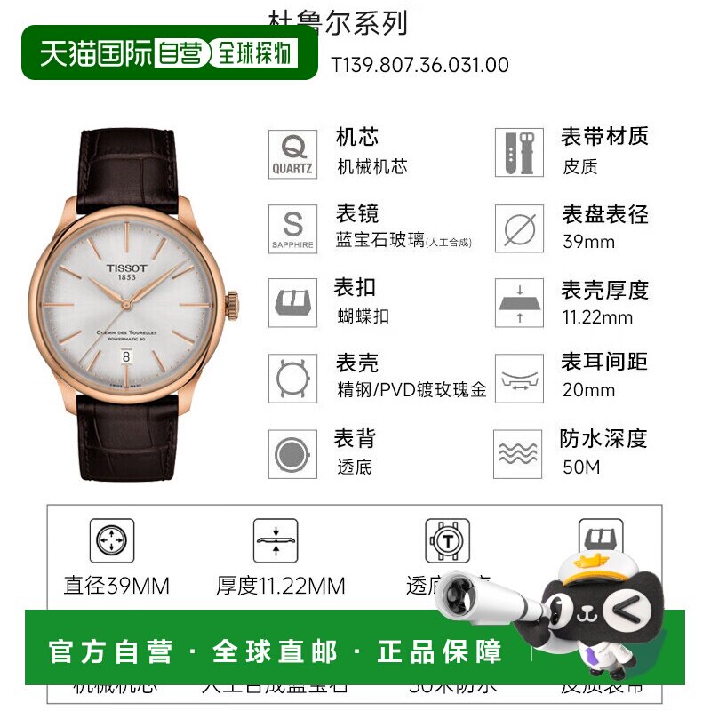 香港直邮【海外版】天梭TISSOT瑞士正品自动机械男腕表T139.807.3