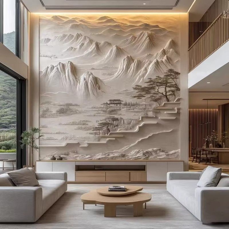 18D立体新中式茶室碳晶板山水石纹浮雕背景墙办公室养生馆护墙板