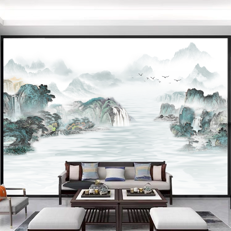 新中式客厅电视背景墙布轻奢养生茶馆壁纸简约现代山水办公室壁画