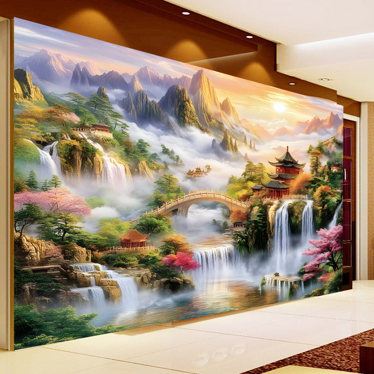 山水画3d立体沙发背景墙装饰画壁纸贴纸办公室风水风景自粘墙贴画