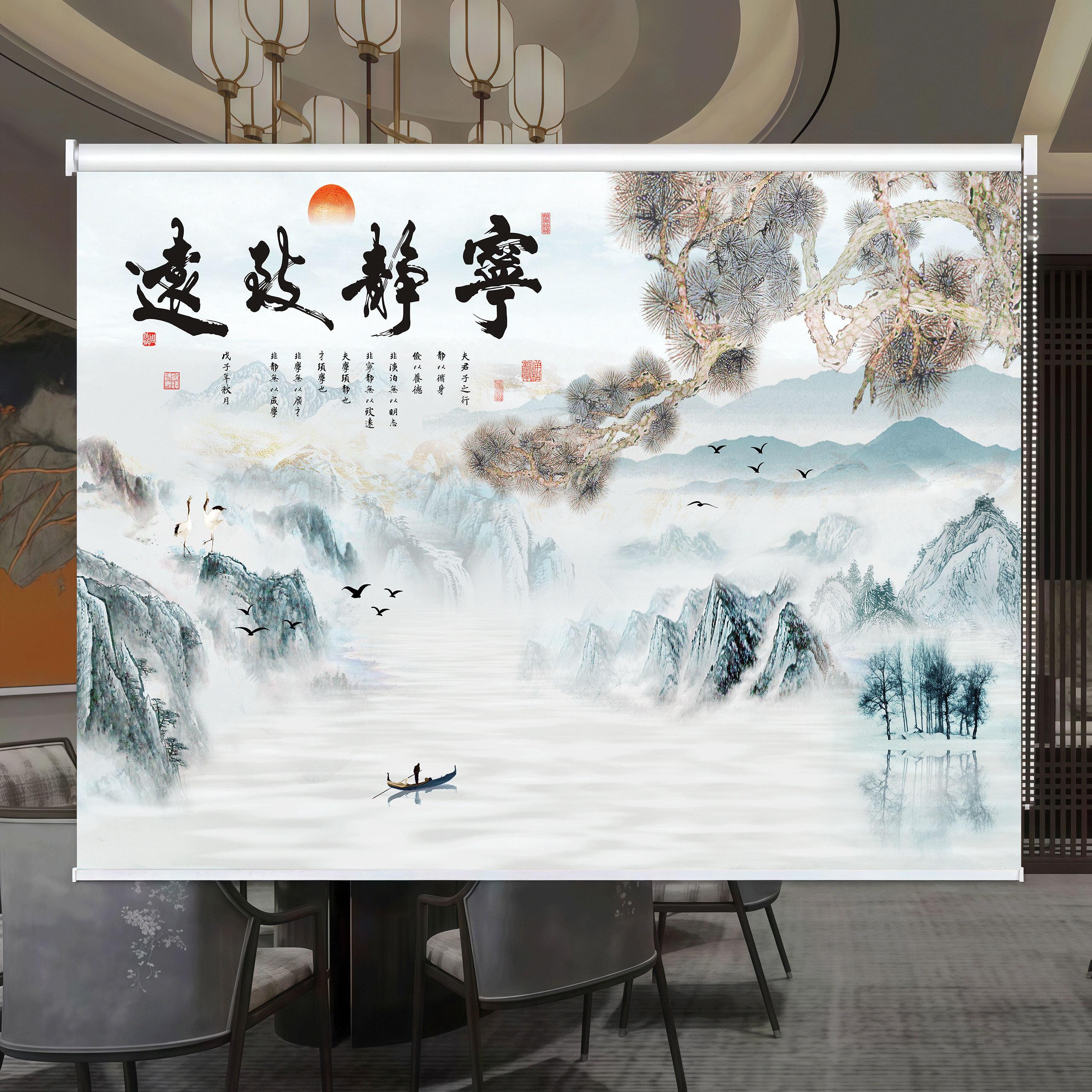 中式山水画遮光卷帘办公室会议客厅卧室窗帘防晒隔热手拉升降电动