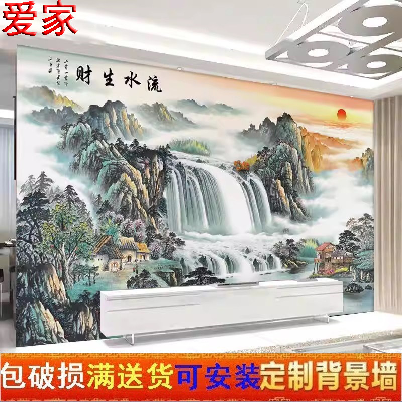 自粘墙贴画新中式客厅山水画办公室背景墙装饰壁画流水生财风景画