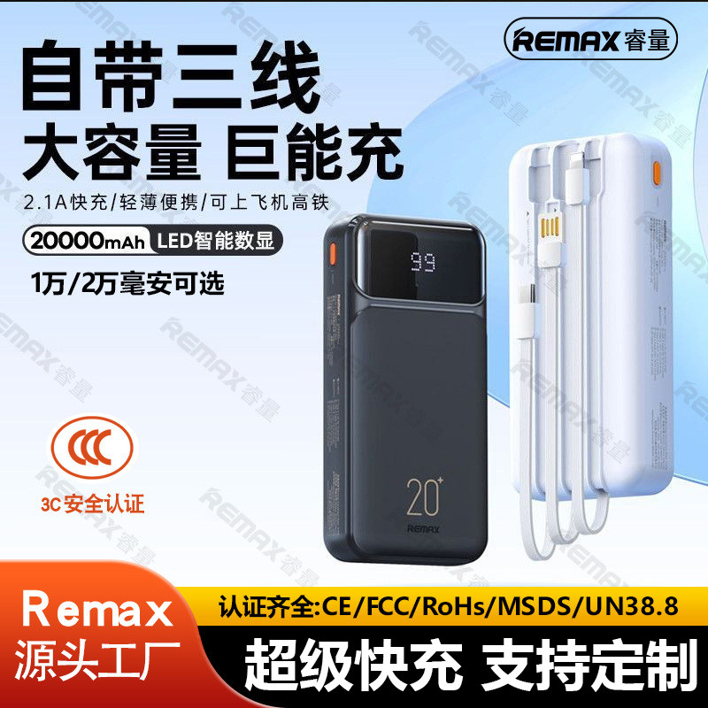 3C认证品胜自带线20000毫安充电宝三合一快充USB超薄移动电源定制logo礼品订制刻字适用华为小米苹果17手机16