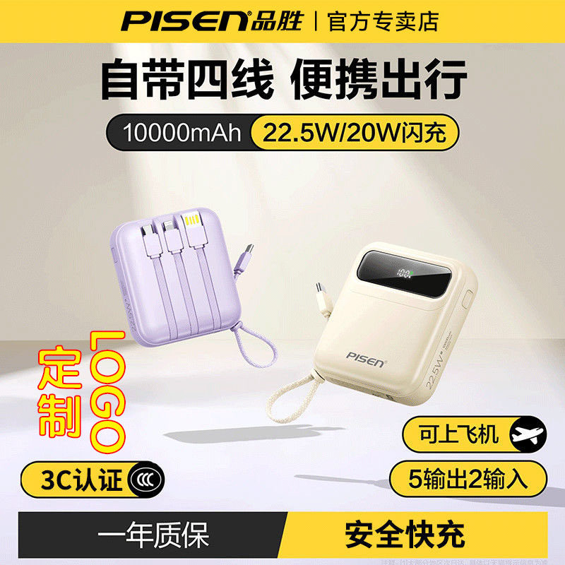 【logo定制】品胜四线充电宝2025新款3C认证大容量10000mAh超薄小巧迷你标识移动电源22.5w快充可上高铁飞机
