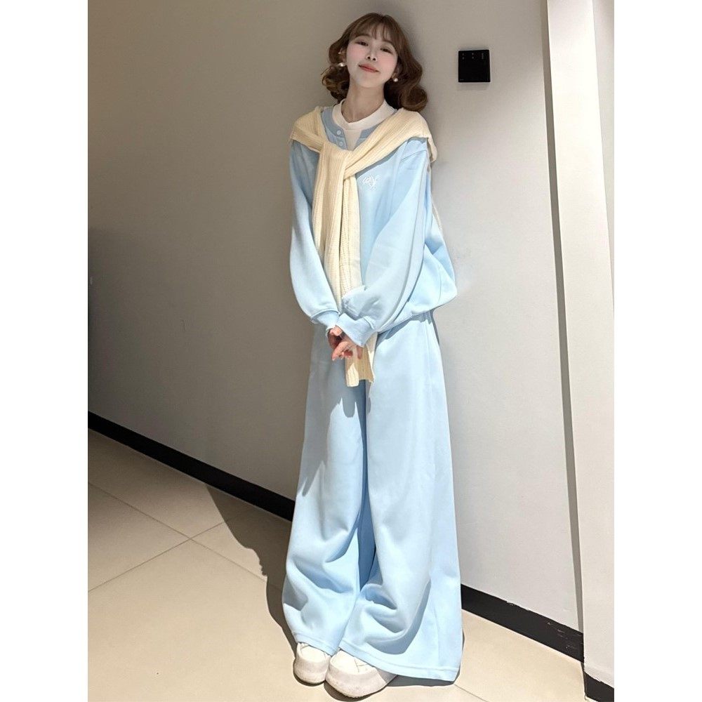 休闲运动服蓝色卫衣高腰阔腿裤女2025开秋季新款超火时尚两件套装