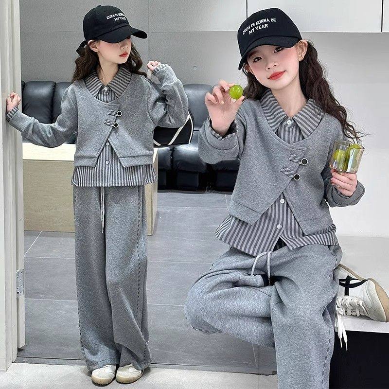 春秋季新款女童衬衫假两件套装中大童洋气时髦上衣裤子休闲运动服
