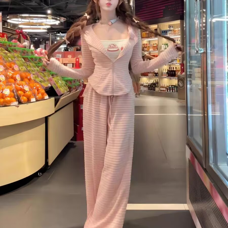 2025新款粉色条纹减龄休闲运动穿搭一整套女早秋季小个子两件套装