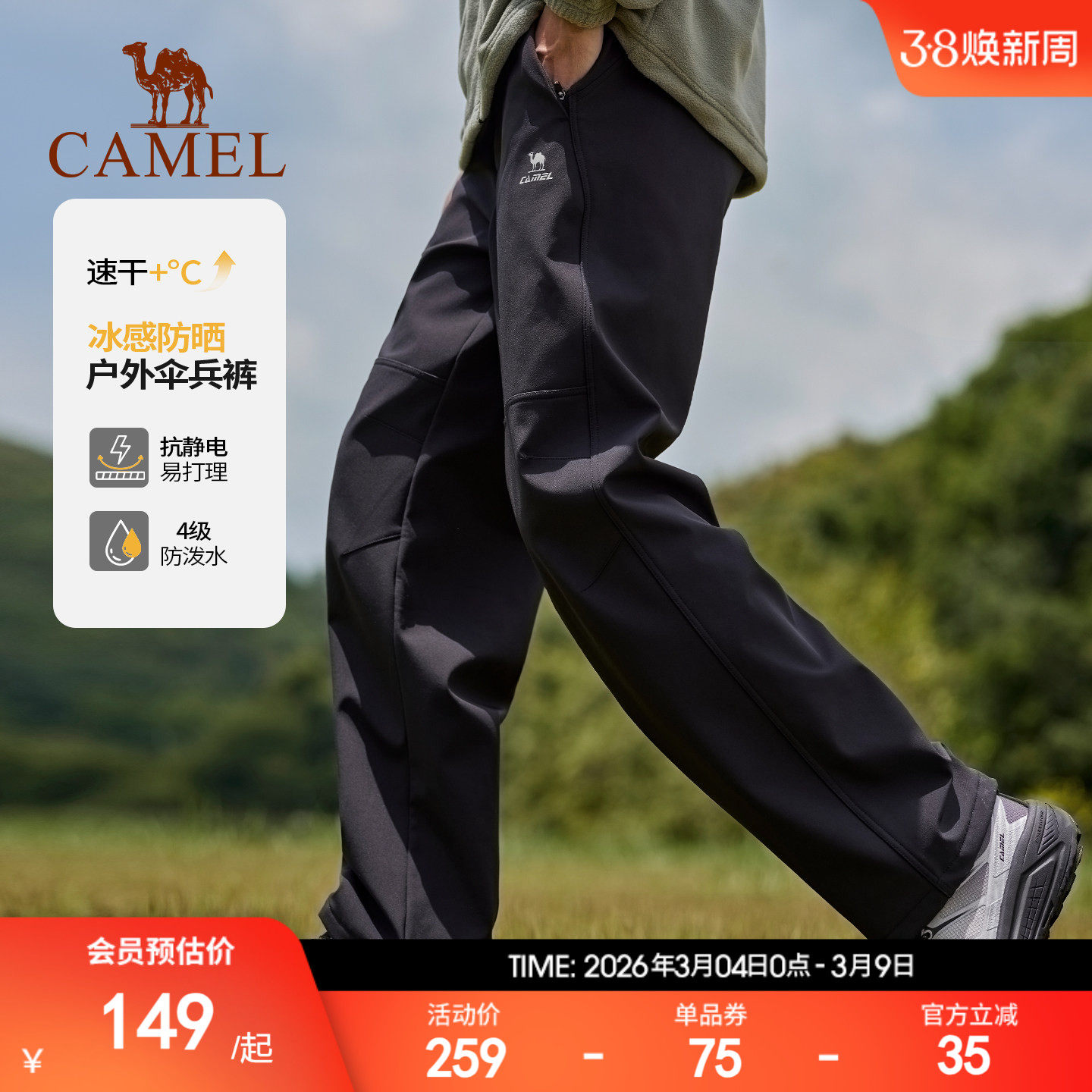 火壳骆驼运动裤男速干户外伞兵裤防水防风冲锋裤登山软壳裤工装裤