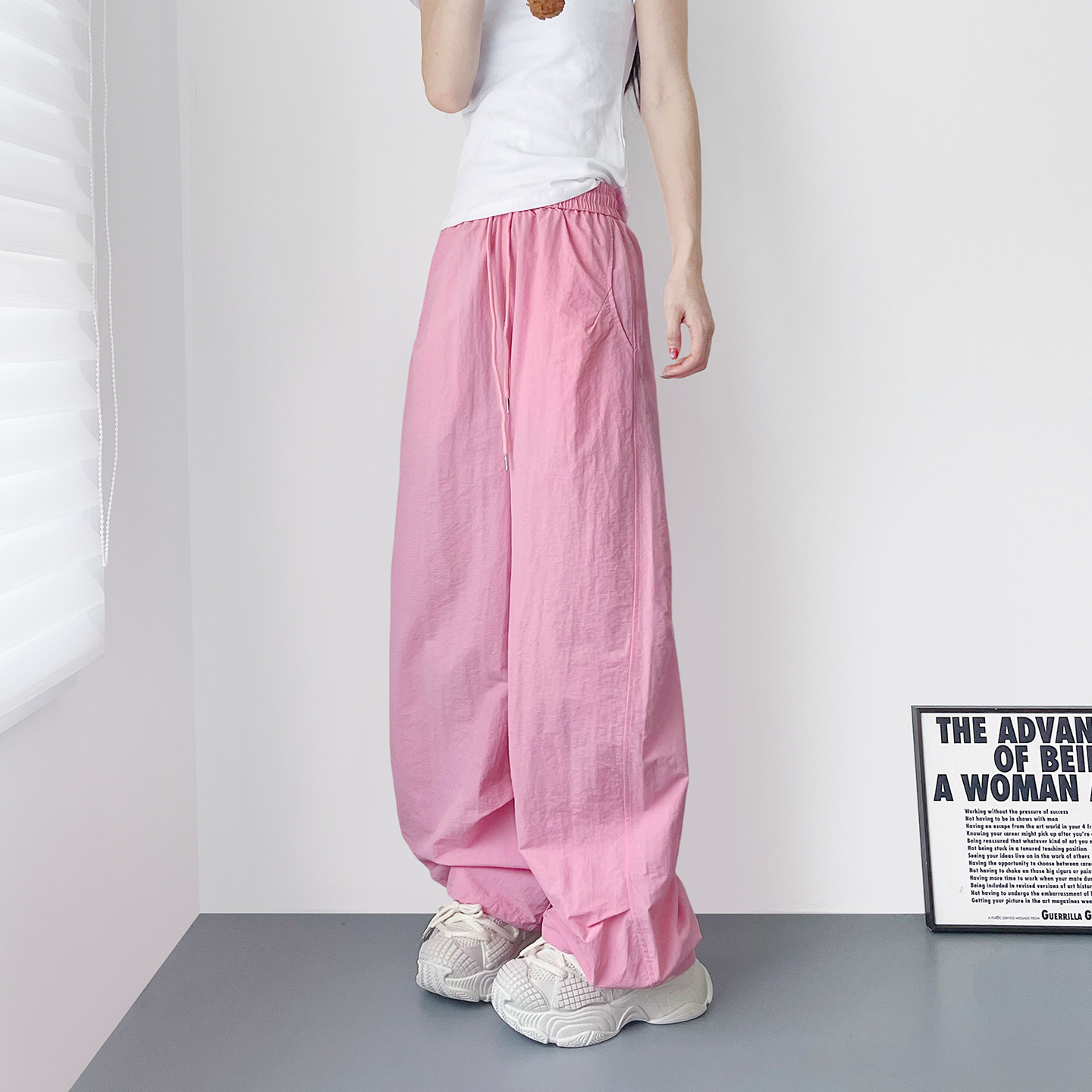 白色夏季清凉阔腿裤女大码胖mm显瘦遮肉休闲裤高腰抽绳速干运动裤