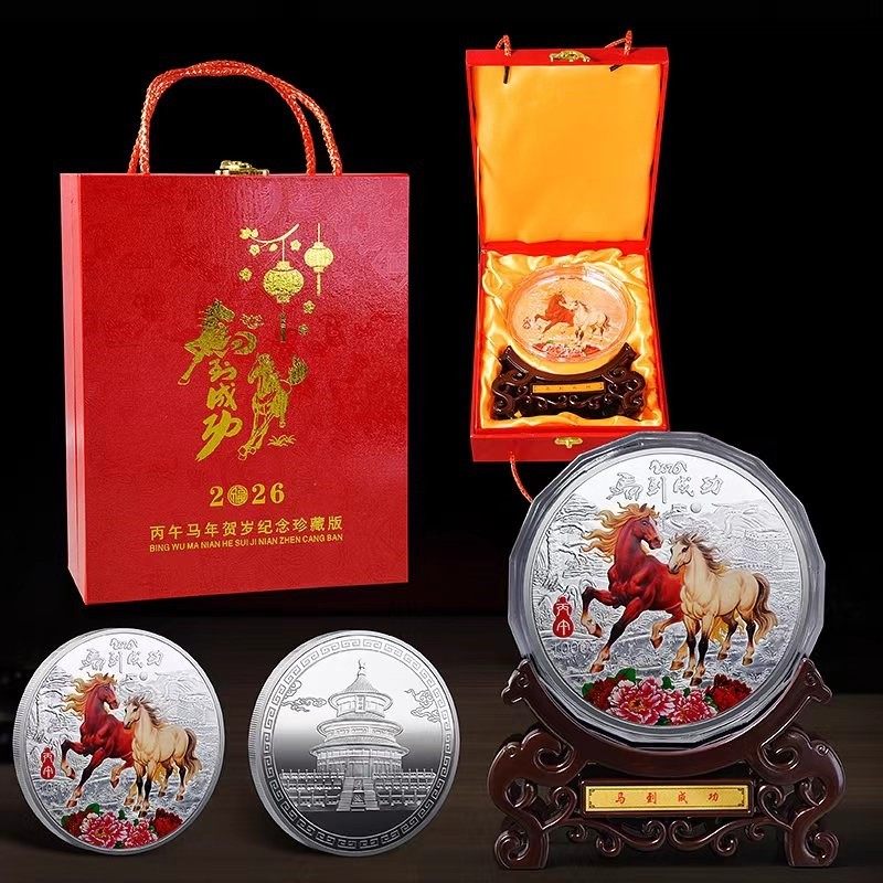 2026年马年生肖纪念彩色纪念章马到成功纪念币银盘摆件收藏送礼