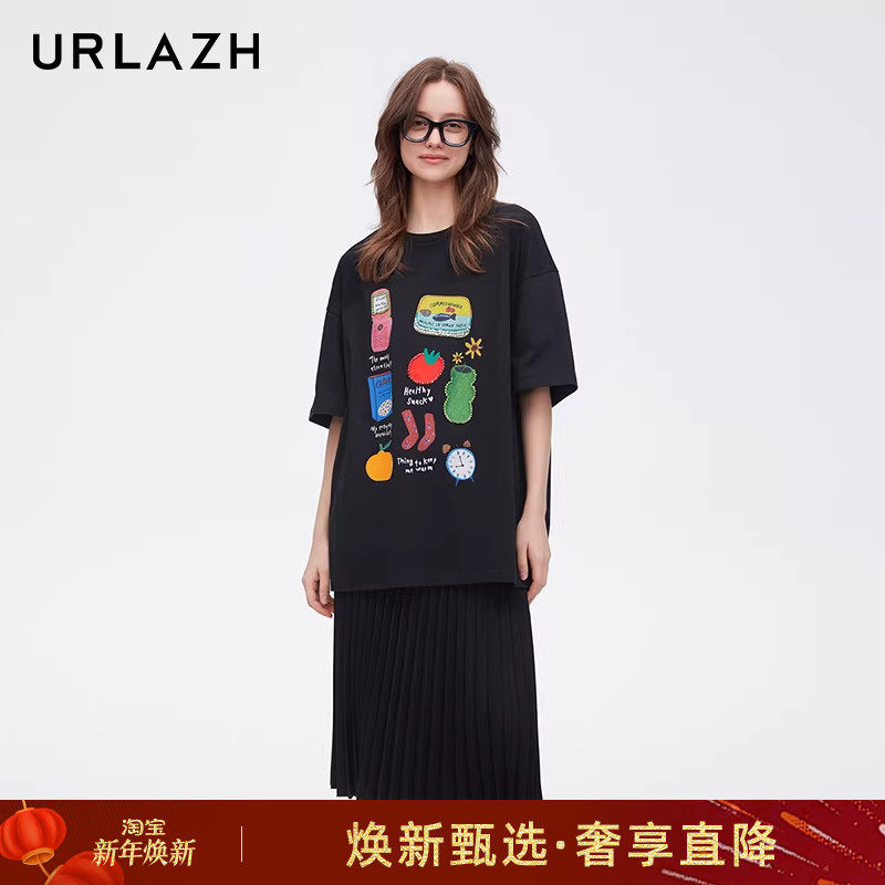 URLAZH有兰春季新款纯棉黑色印花简约休闲宽松卡通动漫短袖T恤女