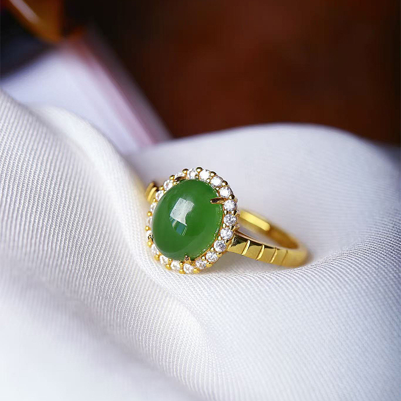天然俄罗斯碧玉冰绿蛋面纯银镶嵌戒指 男女款玉石镶嵌款饰品礼物