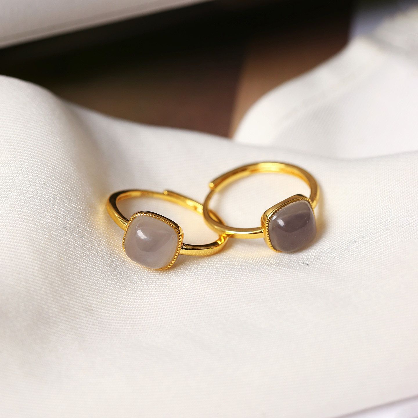天然和田玉糖料方糖款戒面纯银镶嵌戒指 女款简约款玉石戒圈饰品
