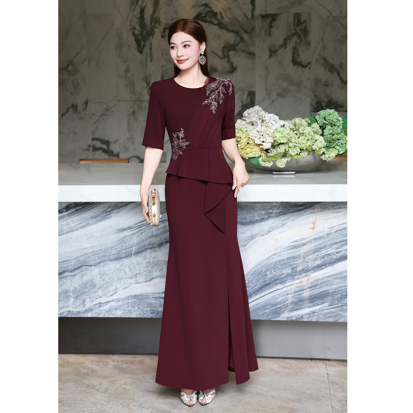 2025年夏季酒红色亮片重工钉珠遮肉显瘦晚装礼服连衣裙婚礼妈妈装