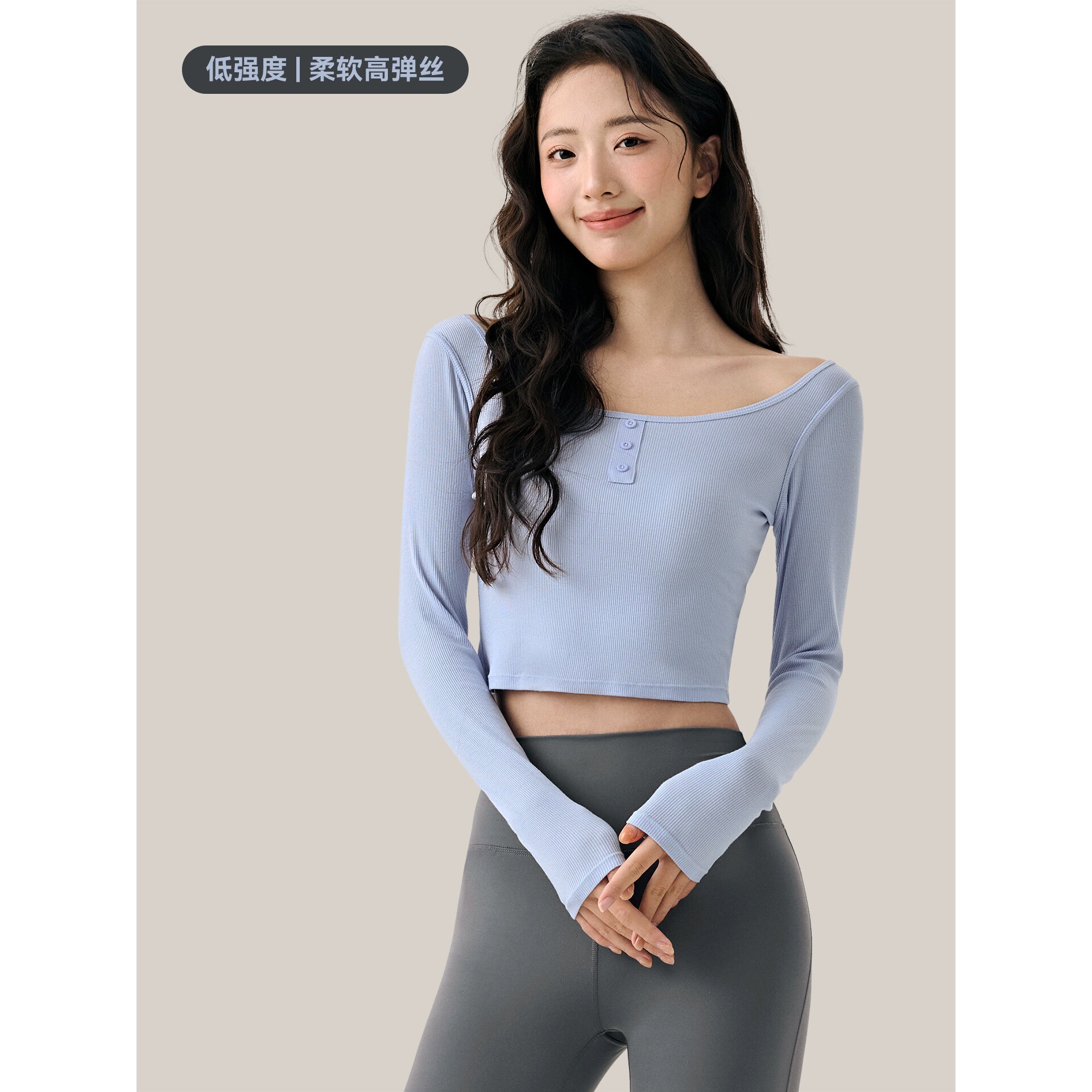 圆领修身长袖瑜伽服女显瘦运动外穿时尚亨利领短款健身瑜伽服上衣