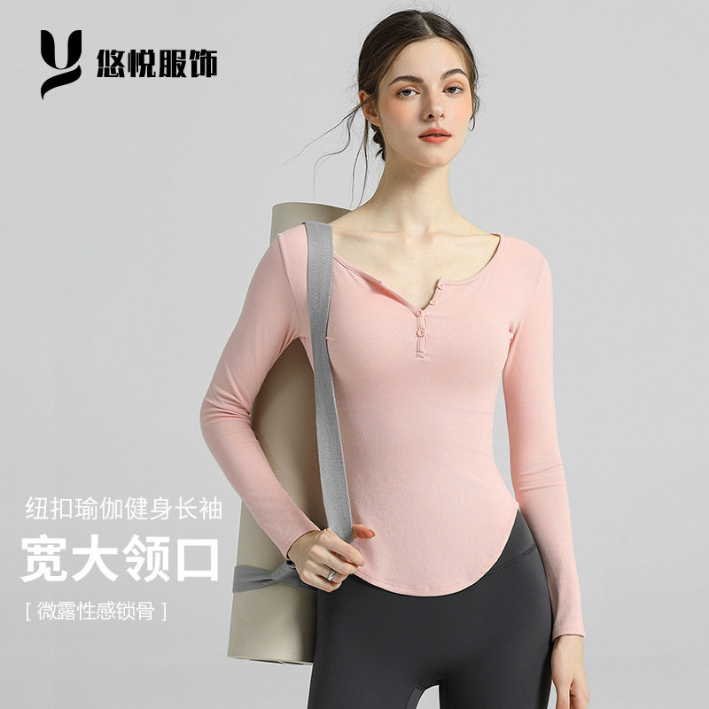 秋季新款V领瑜伽服女显瘦普拉提长袖健身t恤气质跑步运动纽扣上衣