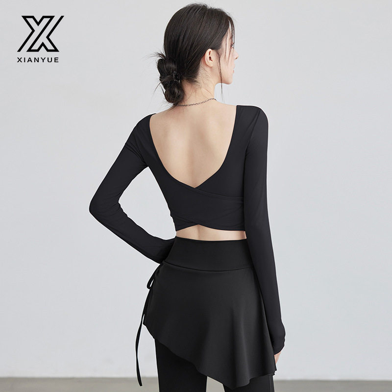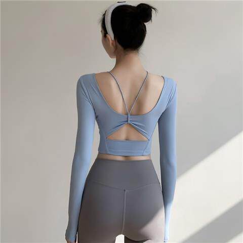 新款瑜伽服女显瘦露背上衣含胸垫长袖美背跑步训练服普拉提健身服
