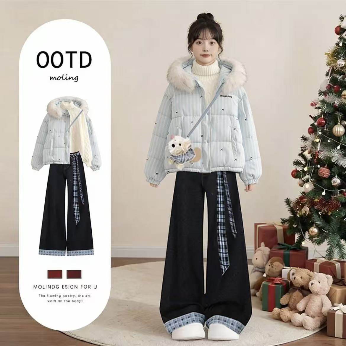 2025少女冬装新款高中生学院风羽绒棉服外套炸街牛仔裤两件套装潮