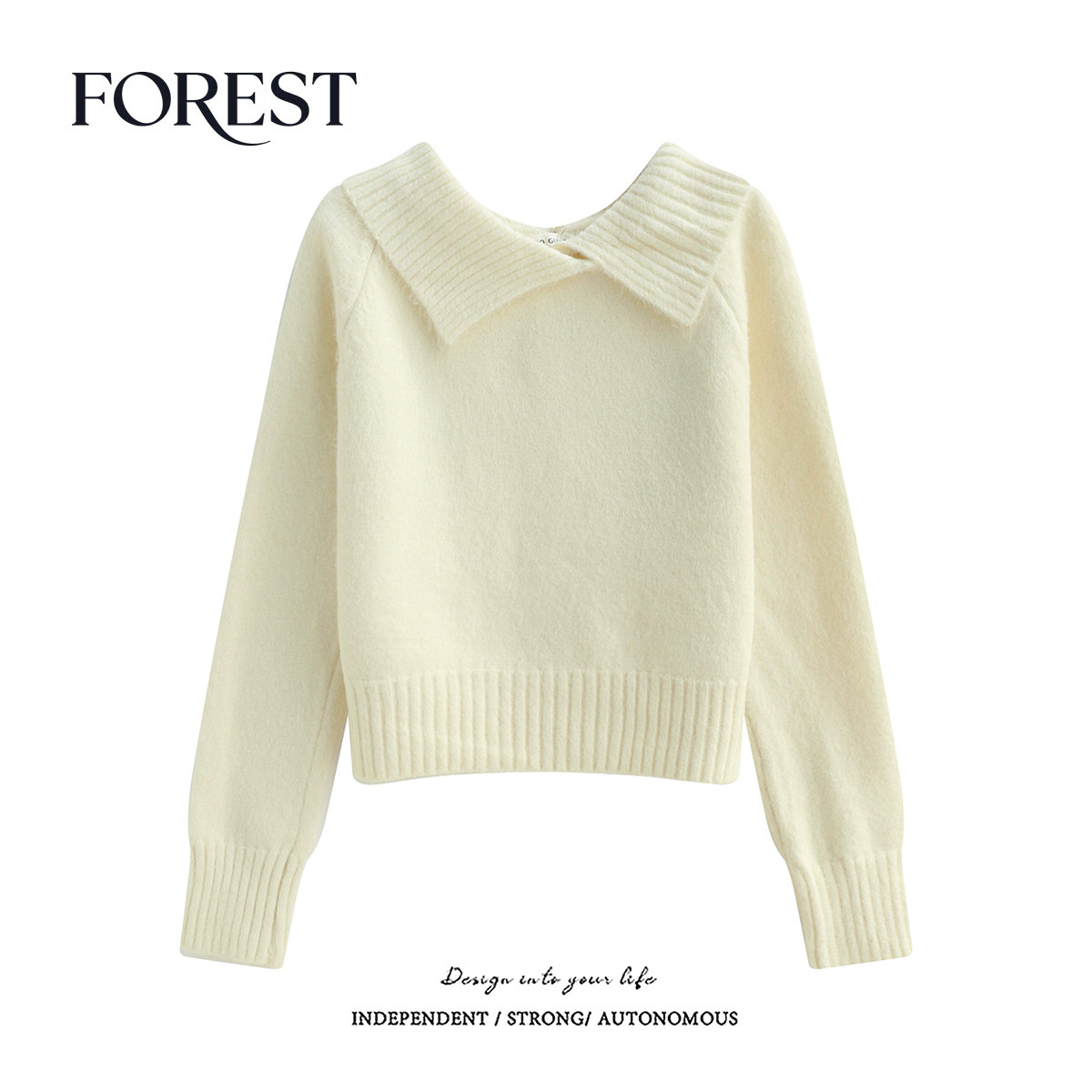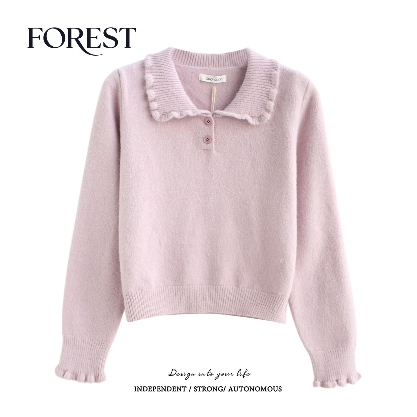 拾野森 冬装新款韩系学院风少女短款木耳边翻领长袖套头毛衣上衣